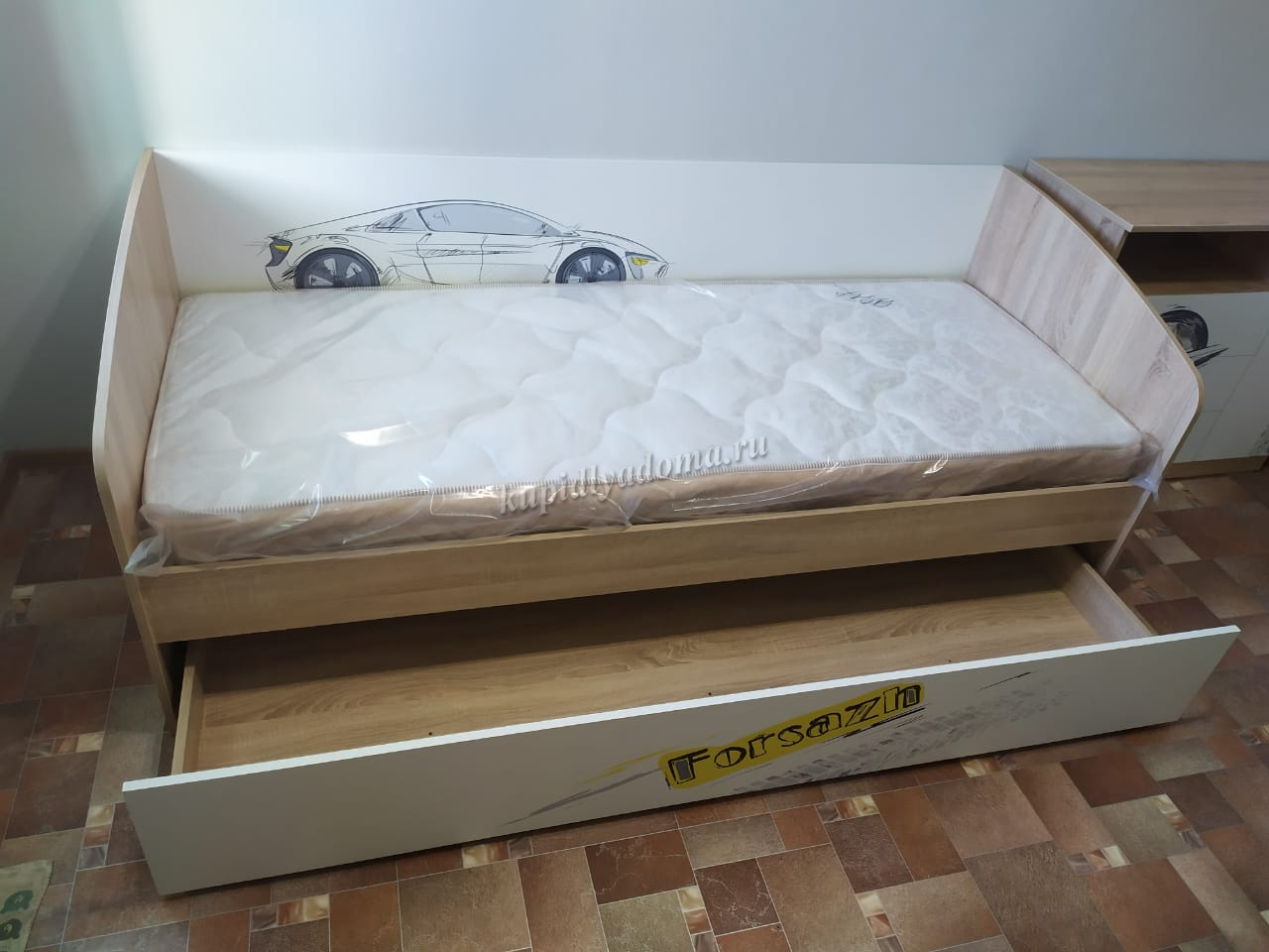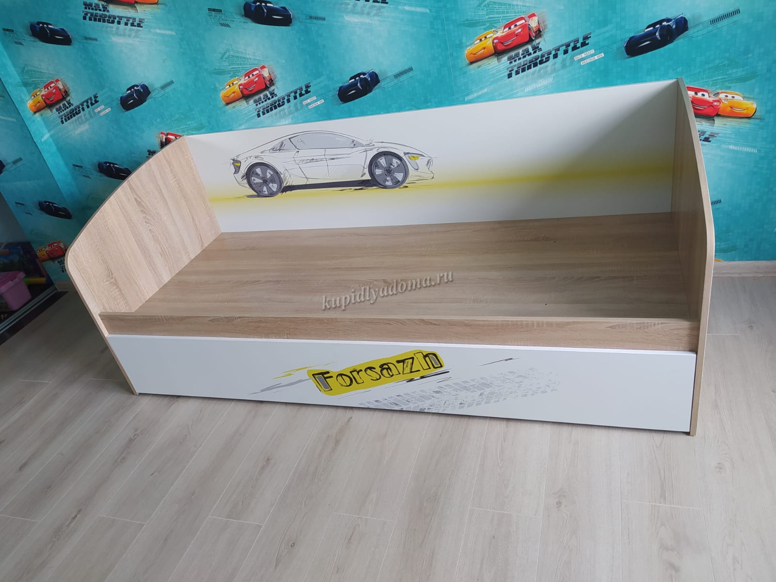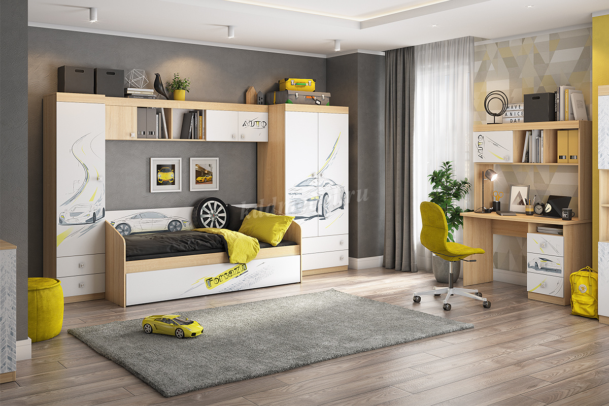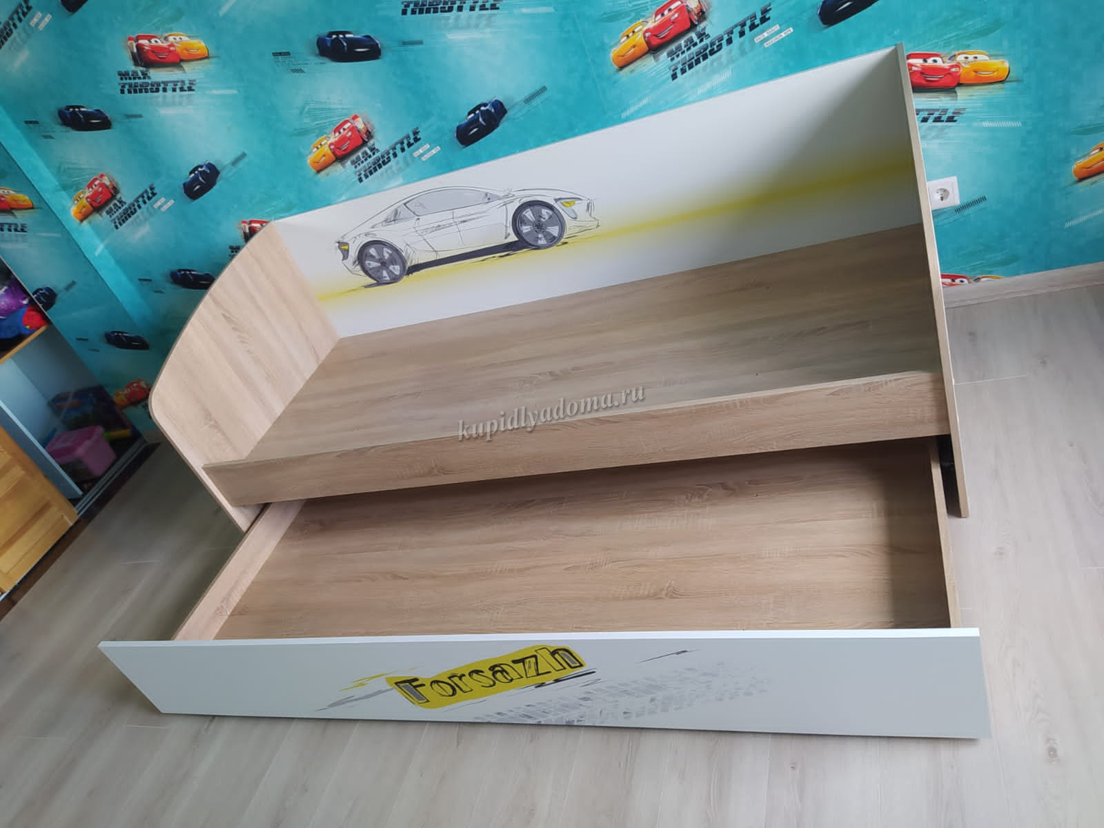 Дополнительное удобное спальное место или большой выдвижной ящик для хранения постельного белья и игрушек, на выбор, решать вам. Стильный принтерный рисунок на фасаде. Детская «Форсаж» - это стильная, современная детская, которая понравится каждому ребенку. Рисунок устойчив к истиранию и ультрафиолету.