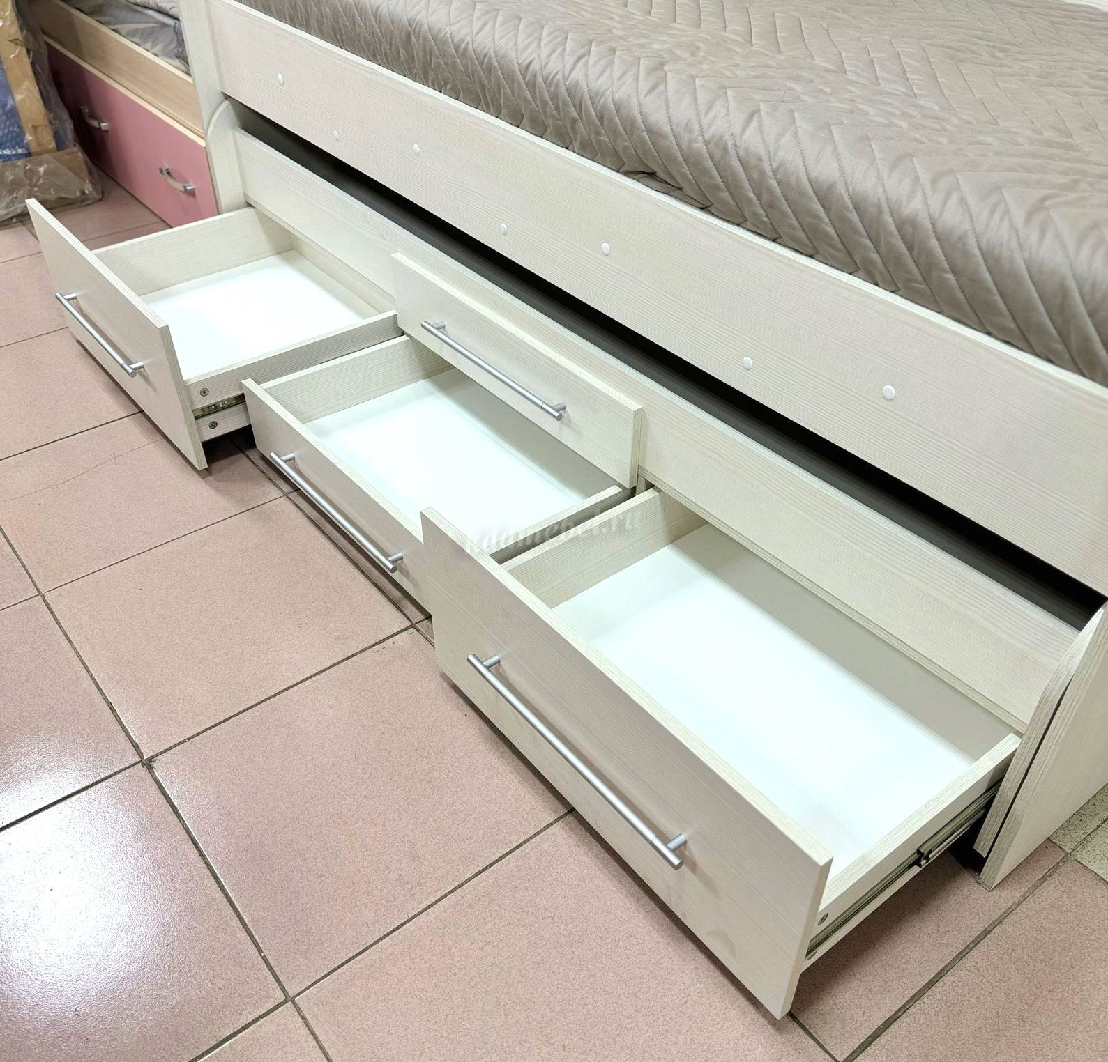 Двухъярусная детская кровать «Адель-5» имеет весьма необычную компоновку. У неё выдвижное нижнее спальное место, благодаря чему общая высота кровати составляет всего 66 см. Нижний блок оснащён двумя парами больших и малых выдвижных ящиков для постельных принадлежностей, а также колёсиками, поэтому для его выдвигания вам не потребуется значительных усилий. Размеры спальных мест отличаются. Кровать оборудована боковинами и задней спинкой.