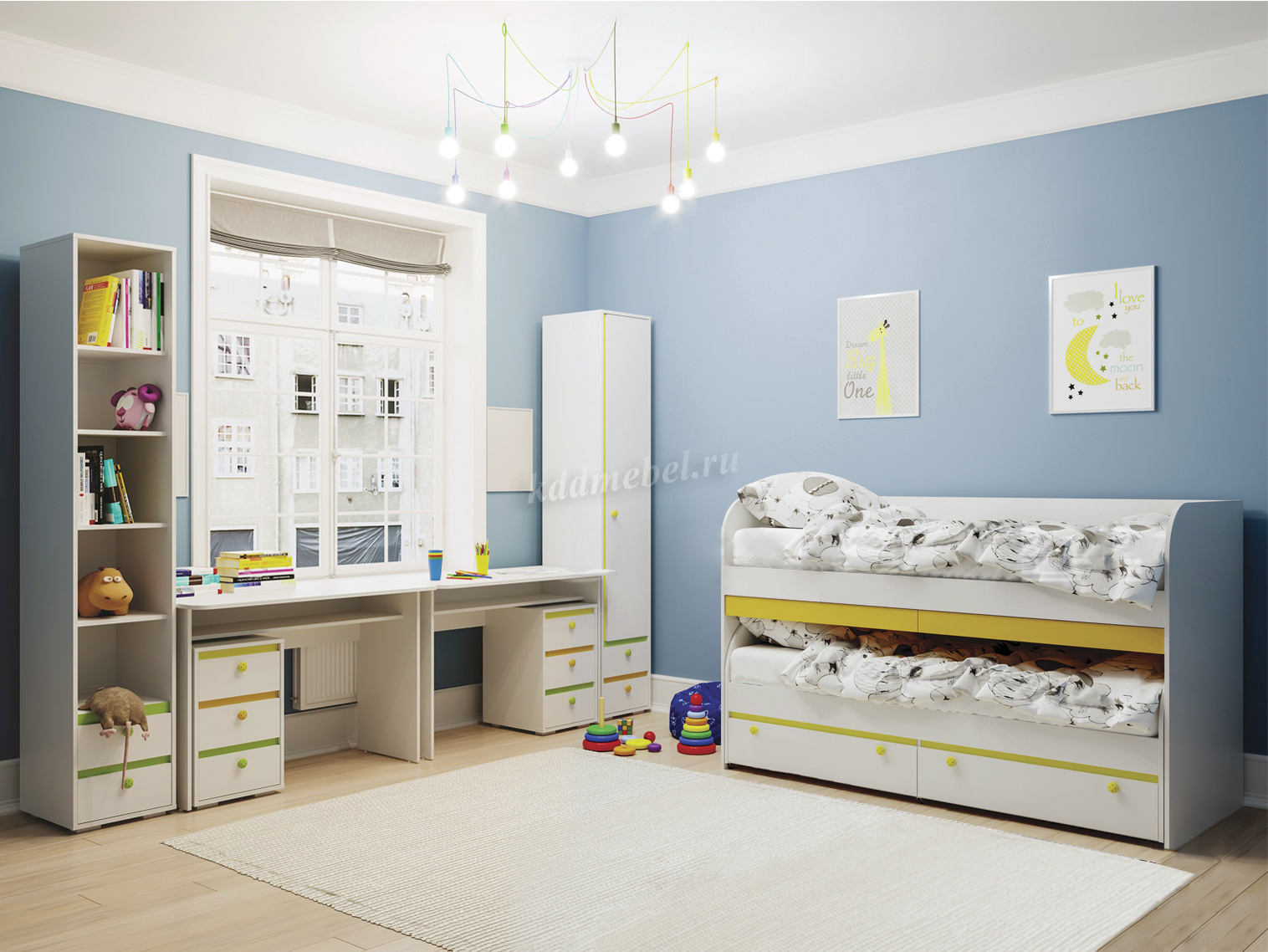 Кровать двухъярусная с выкатными столиками для творчества, служащая надстройкой над КР-01 для экономии пространства в комнате.