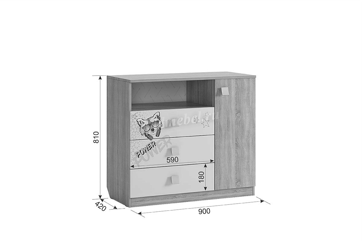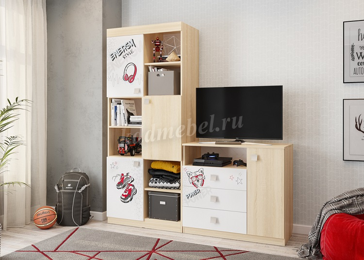 Стильный комод «Энерджи» – мечта каждого подростка. В 3-х выдвижных ящиках и 2-х удобных закрытых  нишах за одним фасадом можно разместить все вещи подростка.  Эффектный принтерный рисунок на фасадах выдержан в общем стилистическом решении. Рисунок устойчив к истиранию и ультрафиолету. Детская «Энерджи»- все, что нужно для подростка!