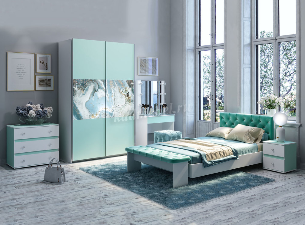 Нежно-бирюзовые тона корпусов коллекции, в обрамлении снежно-белой кромки идеально гармонируют с белыми фасадами, украшенными ювелирными ручками.   Полноразмерная "парящая" кровать с нижней подсветкой декорирована мягким изголовьем из благородного бархата цвета Тифани с сияющими стразами. Туалетный столик оснащен подсветкой, розеткой и выключателем . Неоспоримой изюминкой туалетного столика является съемное стеклянное покрытие столешницы с фацетной кромкой. Тифани - изящество и утонченность истинных леди!