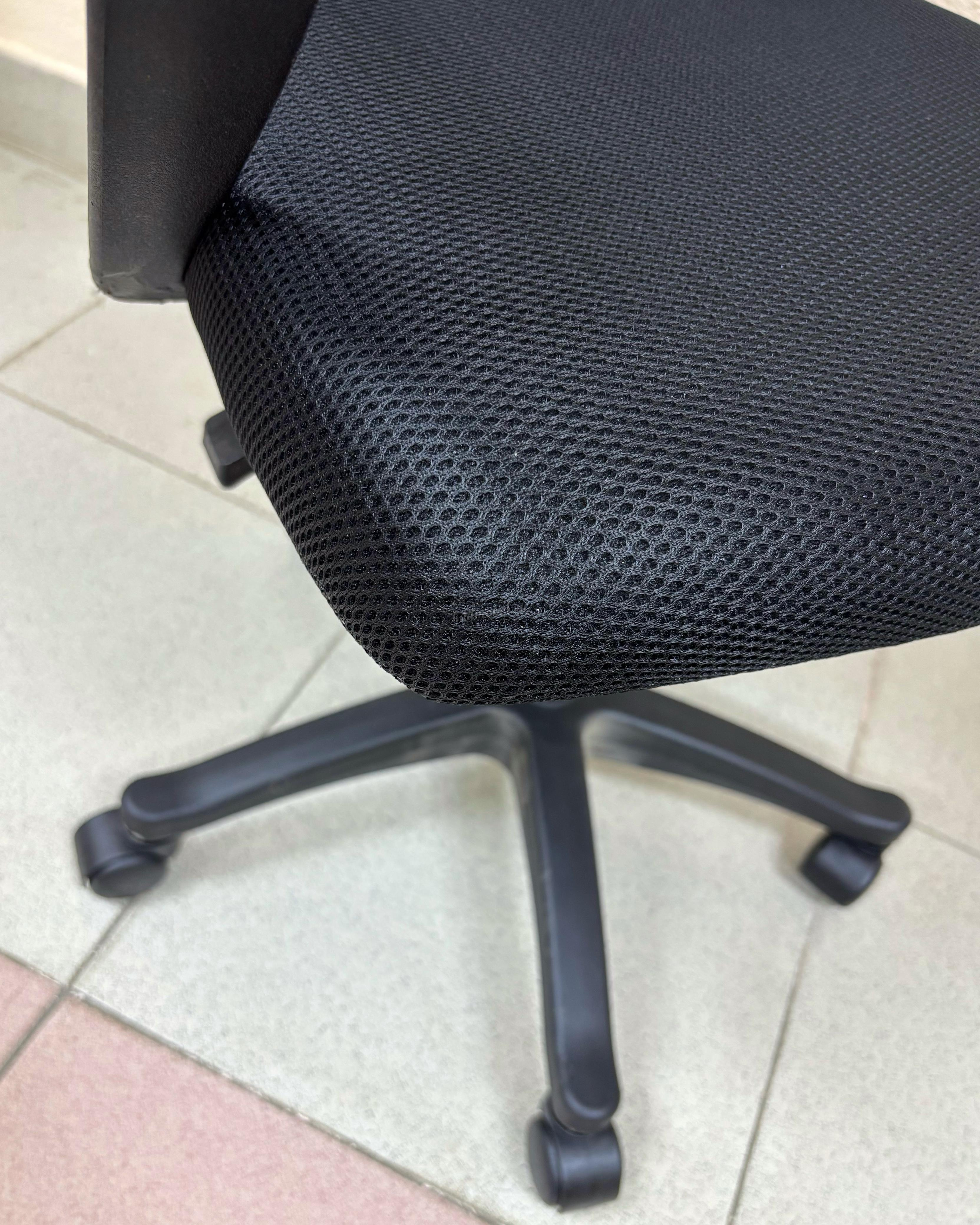 Современное офисное кресло с удобной спинкой, сиденьем из акриловой сетки и устойчивым пятилучным пластиковым основанием, снабжённым 50-мм двойными колёсиками.
