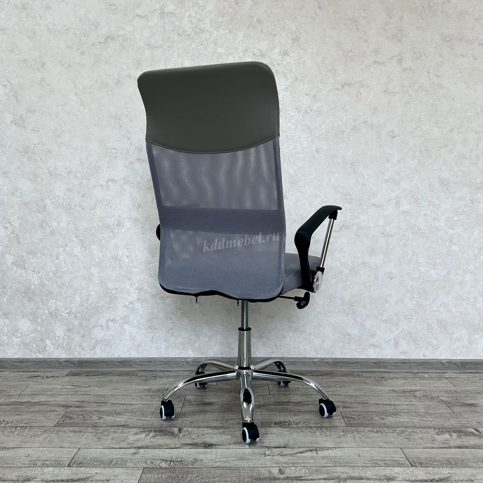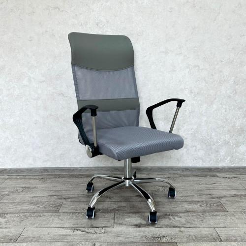 Современное офисное кресло с высокой спинкой, сиденьем из сетки и устойчивым пятилучным хромированным основанием,