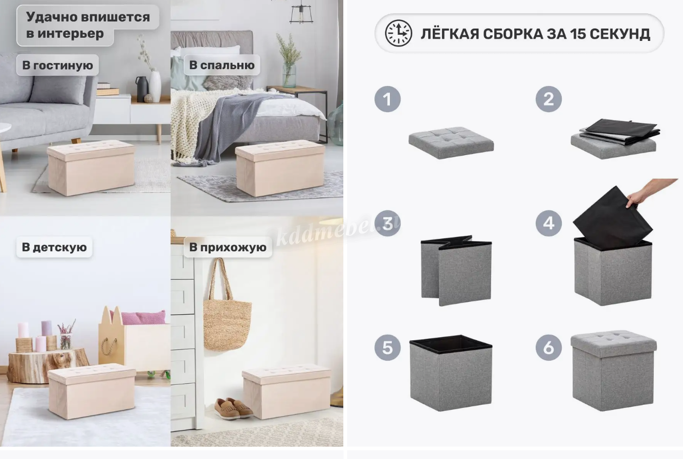Пуф с ящиком для хранения Леда – функциональная вещь для дома из коллекции Leset. Пуфик-банкетка наведет порядок в вещах и не утяжелит пространство. Пуф в прихожую удобно использовать как мягкий стульчик для обувания. Если у вас компактная комната или маленькая прихожая, мебель с возможностью складывания отличный выход. Пуфик в прихожую собирается за 10 секунд! Также пуф складной с ящиком для хранения станет временным пристанищем для игрушек, книг, гаджетов, мягкий пуфик можно придвинуть к кровати в спальне, сложить и убрать под стол, велюровый пуфик идеален для туалетного столика, в примерочной. Пуфики Леда доступны в оттенках антрацит, какао, крем. Обивка – износостойкая ткань велюр, сидение декорировано стяжкой, прочный каркас пуфа с ящиком рассчитан на нагрузку 100кг.