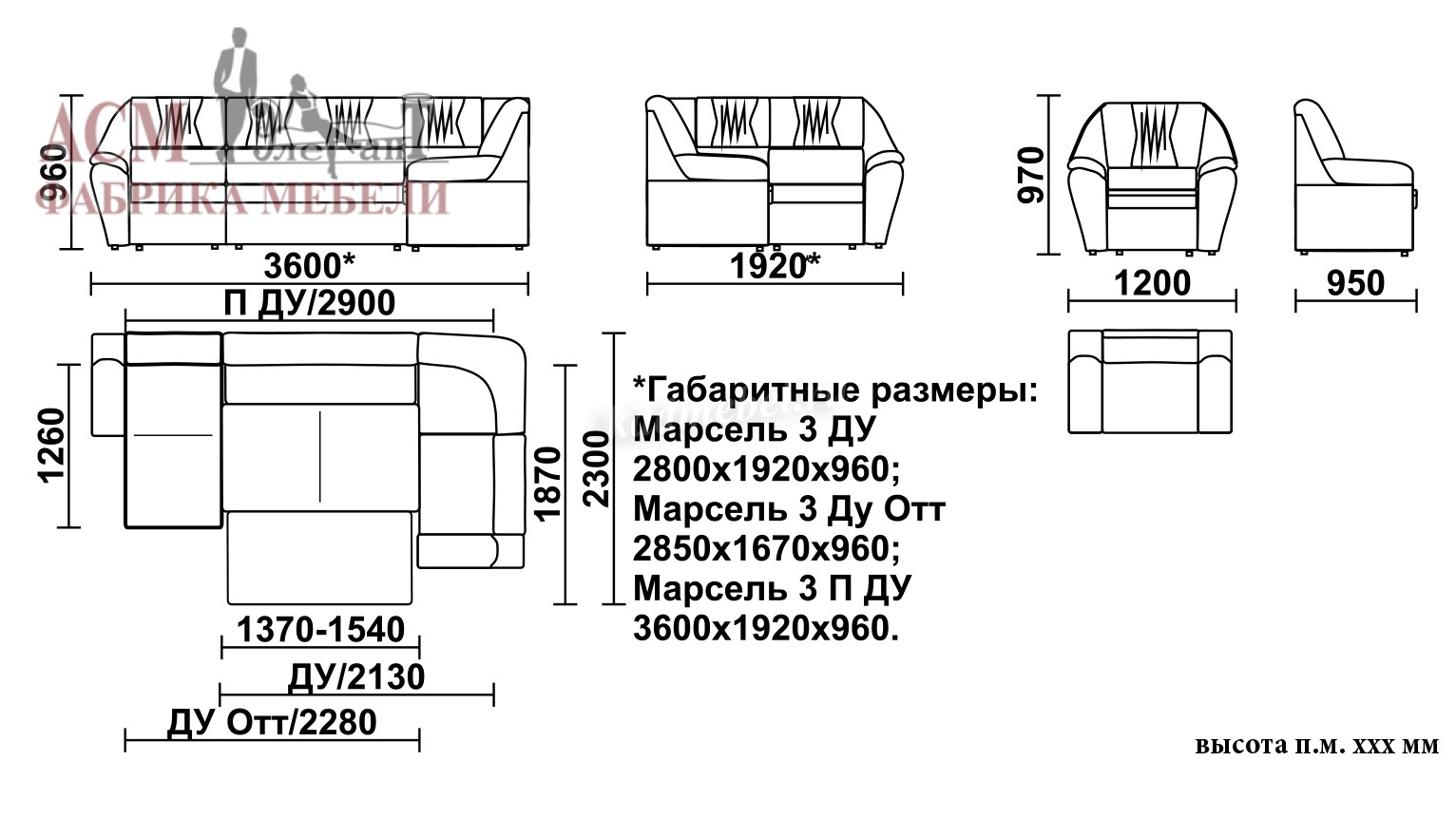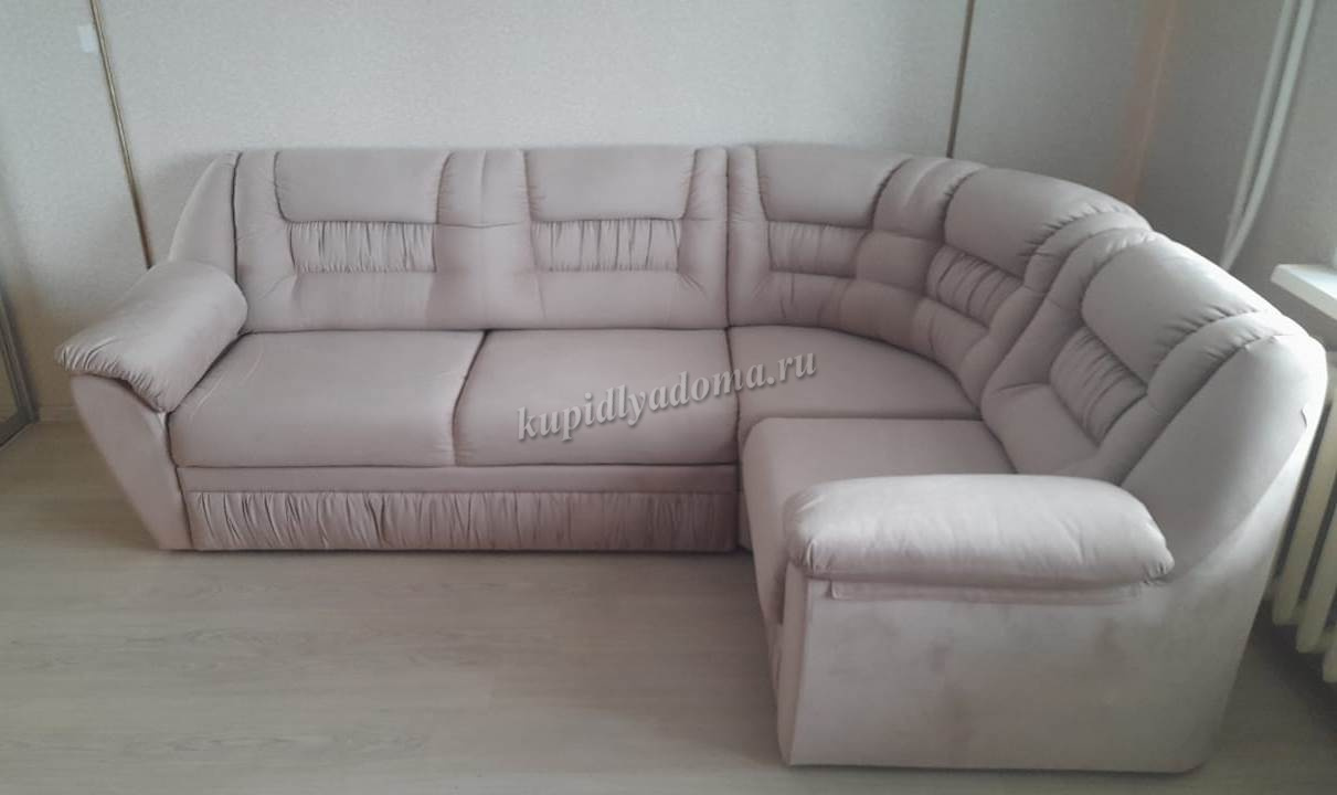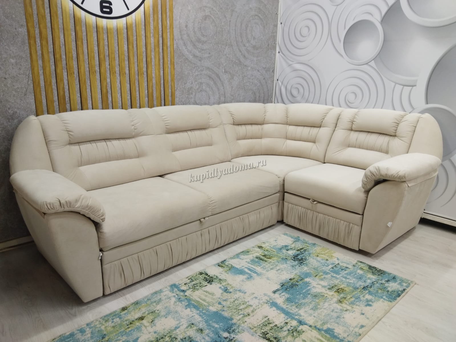 Угловой диван габаритного типа. Направление угла универсальное, сборка производится без инструмента. Состав модели. Диван с механизмом «акнар» – 1шт. Приставное кресло с емкостью и подъемным механизмом - 1 шт. Съемная подушка на подлокотнике – 2шт. Наполнение: спинка из упругого эластичного ППУ 22; спальное место состоит из трех элементов сиденья дивана, подголовника и рамы механизма «акнар». Обвивка ткани: в одной или двух тканях (1 – сиденье, спинка; 2 - нижняя часть каркаса). Возможно полностью в кожзаме. Жесткость спального места среднее. Состав: слой ППУ 28 плотности на упругом основании посадочного места типа «змейка», исключение рама «акнар». Емкость для вещей из ДСтП и ДВП.