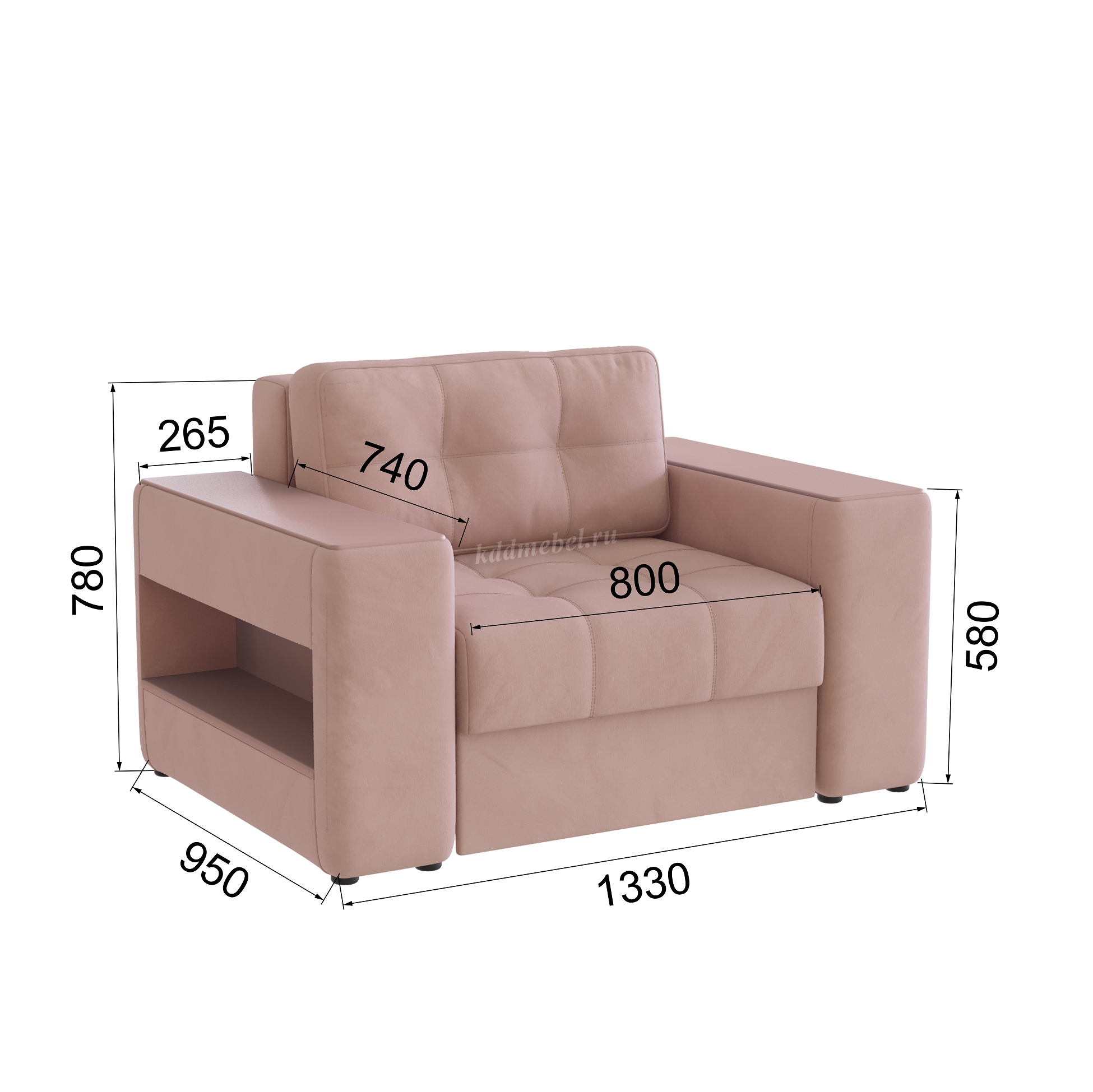 Подлокотники шириной 265 мм, обтянутые тканью и простеганные двойной отделочной декоративной строчкой.