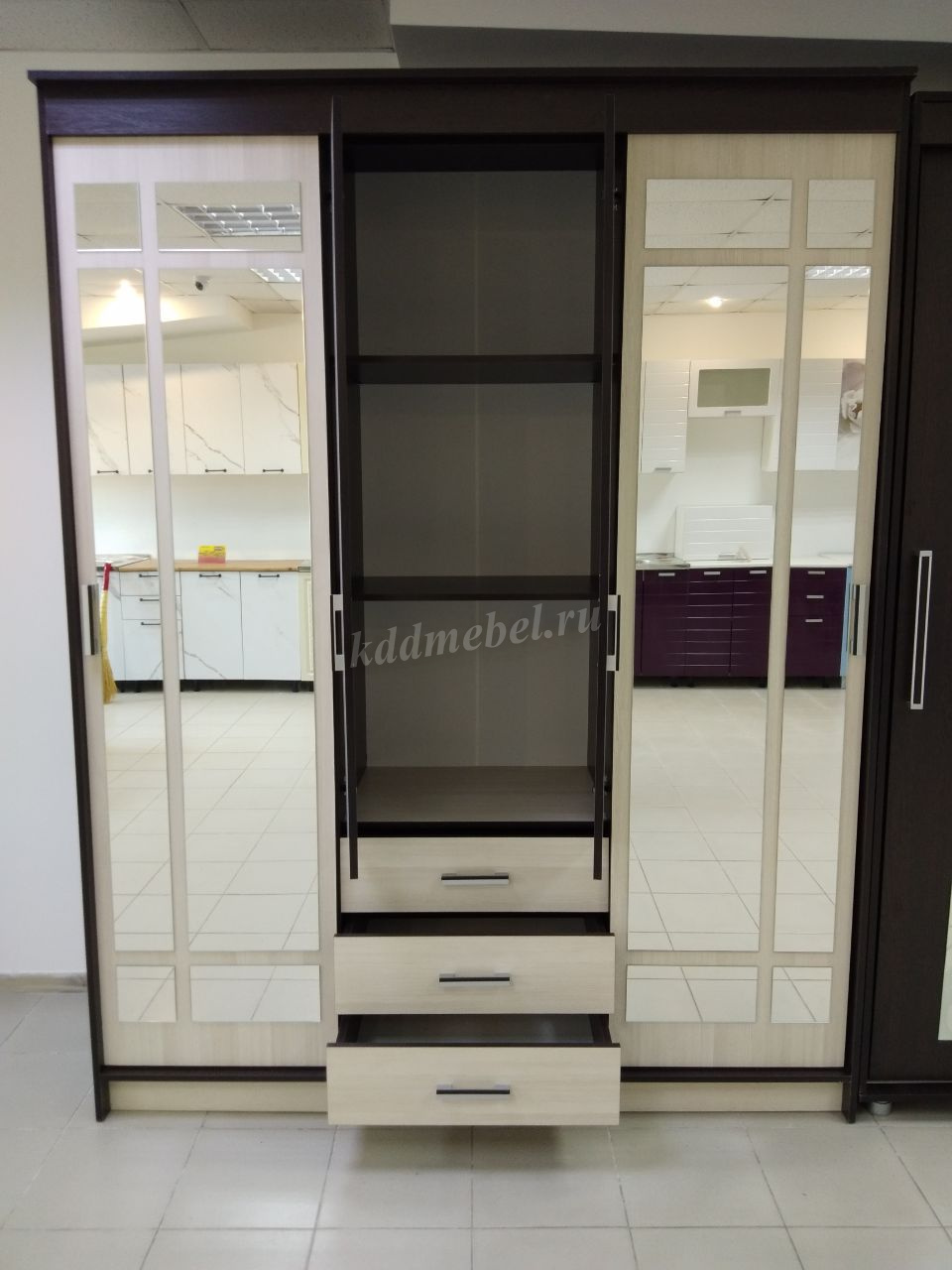 Удобный и вместительный шкаф-купе ЛОРД благодаря необычному дизайну хорошо подойдет интерьеру в любом стиле. Изюминкой шкафа являются оригинальные зеркальные фасады. Шкаф отлично будет смотреться в спальне или прихожей, добавляя помещению света. Два боковых отделения шкафа предназначены для хранения одежды и комплектуются антресольной полкой и 3 штангами. Центральное отделение в нижней части оборудовано тремя вместительными ящиками, верхняя часть с распашными дверцами комплектуется полками.